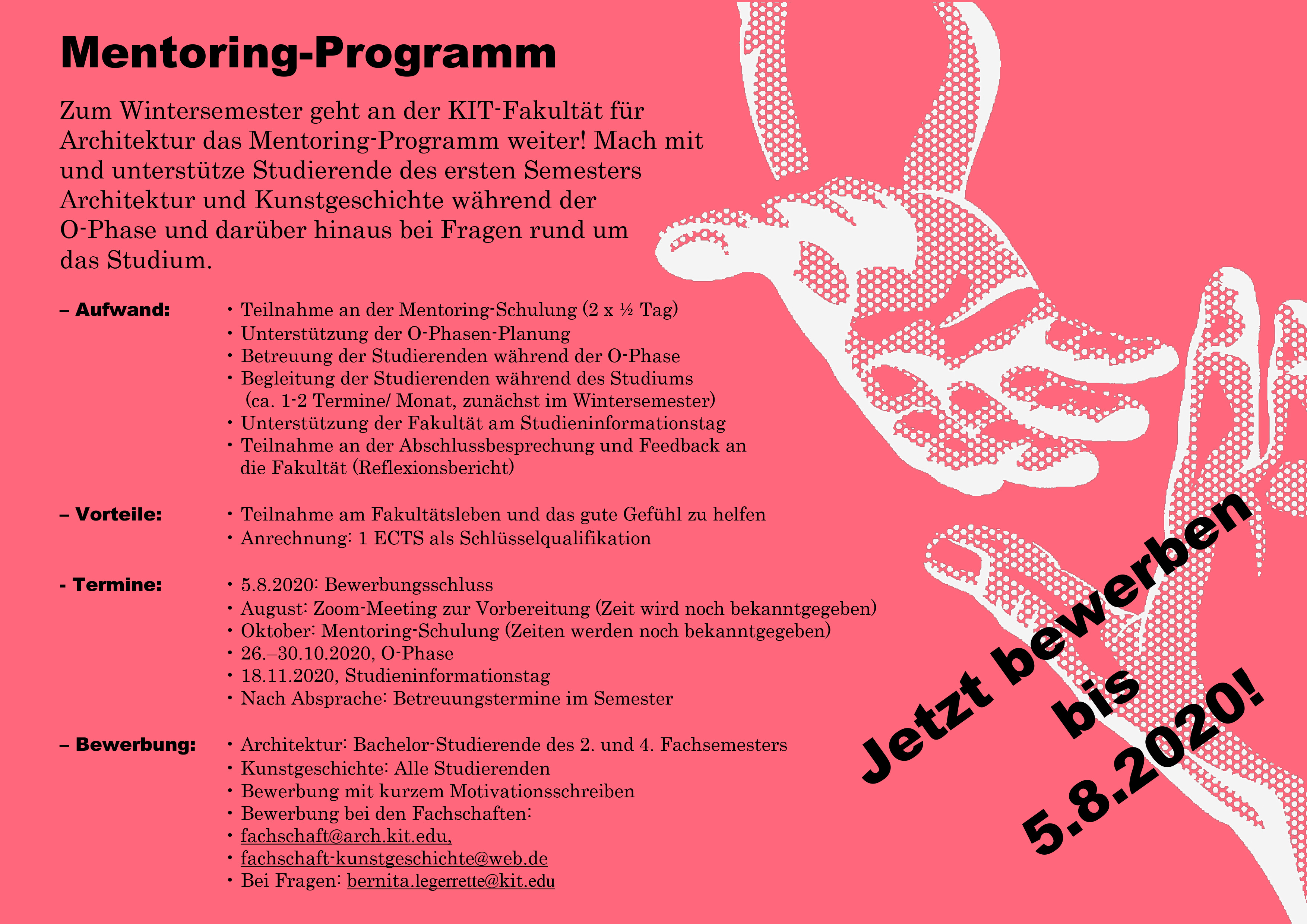 Zum Wintersemester geht an der KIT-Fakultät für Architektur das Mentoring-Programm weiter! Mach mit und unterstütze Studierende des ersten Semesters Architektur und Kunstgeschichte während der O-Phase und darüber hinaus bei Fragen rund um das Studium.